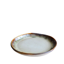 The surface of each piece is hand-brushed with a non-toxic, food-safe white gloss glaze, leaving the edges of and base of the plate with a vitrified stone-like surface with a tactile feel.